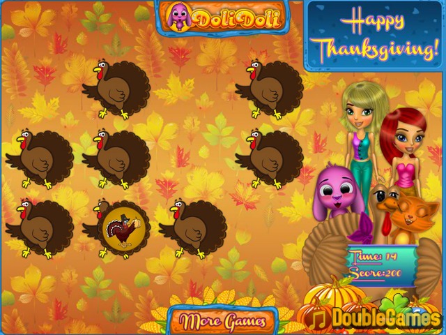 Acción de gracias es la vuelta de la esquina y apostamos a algunos de ustedes tienen un montón de tiempo libre y quieren jugar a una acción de gracias nuevo juego en línea! Bienvenido a Doli Thanksgiving Cards, sorprendente y divertida aventura donde llegar a unirse a los amigos Doli y emparejar las cartas con fotos fiestas lindas. ¿Puede hacerlo con un abrir y cerrar de ojos? Compruebe sus mejores habilidades, mejorarlos y tener un montón de diversión.