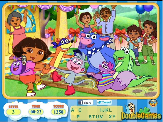 ¡El nuevo juego divertido y educativo Dora the Explorer - Find the Alphabets no es sólo la diversión, sino también una gran manera comprobar y practicar sus habilidades! ¡Mire los cuadros de su muchacha de dibujo animado favorito Dora y sus amigos y comience a divertirse! ¡Su tarea principal es encontrar todas las cartas de alfabeto de las imágenes! ¡Algunas cartas son muy fáciles a encontrar, el otro no son, pero usted siempre puede usar la ayuda de indirectas! ¡Venza tres niveles y juego de nuevo! ¡ Dora the Explorer - Find the Alphabets le espera ya! ¡Este juego asombroso es totalmente libre y le traerá mucho placer!