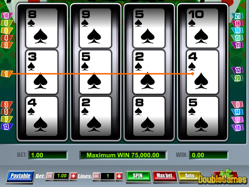 La ranura del póker tiene 21 líneas y 4 baterías. Girar de cada una de las baterías es independiente de otros. La ranura del póker no tiene programa en ello y todas las combinaciones son engendradas al azar. Los símbolos en esta tragaperras juegan tarjetas de la plataforma de 53 tarjetas, de 2 hasta as y un bromista. Hay una posibilidad de premio máximo en este juego. El premio máximo en la ranura de Póker de tragaperras parece al azar y no depende de la combinación caída. Cuándo usted consigue el premio máximo que usted puede ver el signo grande en la pantalla acerca de ello. Usted puede conseguir el premio máximo en cualquier momento incluso si usted juegue la apuesta mínima. Esperamos realmente que usted querrá nuestra completamente nueva tragaperras.