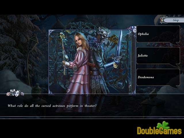 Su primo le envía una carta terrible, le imploraban su ayuda. Angela fue a golpear a la plenitud de su carrera, protagonizando a Ofelia en Hamlet, pero ella es maldecida por una muñeca y ahora se encuentra en su lecho de muerte. ¿Usted puede descubrir al verdadero culpable, o su primera actuación será también su canto del cisne? ¡Descúbrelo en este juego de aventura de trenzado-rompecabezas de objetos escondidos!