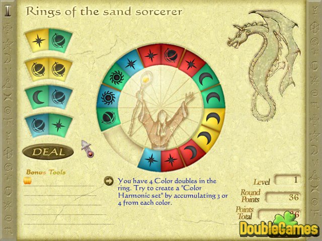 Ring Pass Not es un rompecabezas complicado que usted puede jugar en línea ahora mismo. Su gameplay le captura durante horas y le hace ser aturdido a veces. ¡En Ring Pass Not usted debe resistir al dragón que arroja sobre el fuego! No es tan fácil quedarse dentro del círculo mágico que le protege de ser incinerado por el monstruo. Usted debe corresponder a los azulejos según su color o el símbolo representado en ellos. Hay tres anillos protegiéndole: el Anillo del Hechicero de Llama, el Anillo del Hechicero de Arena y el Anillo del Hechicero del Océano. ¡ Juegue Ring Pass Not en línea y refuerza los anillos para resistir el dragón!