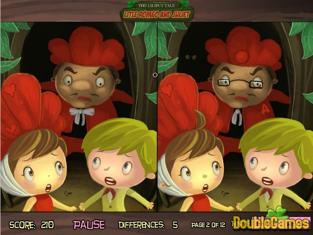 ¡Atestigüe una historia de amor romántica de Romeo y Juliet en un nuevo juego divertido y adictivo según el título Romeo and Juliet en línea! ¡Encuentre las diferencias entre dos cuadros viendo lo que pasará después! Venza todos los obstáculos con los protagonistas principales en su camino hacia la felicidad. ¡Usted puede elegir de tres niveles de la dificultad, y además usted siempre tendrá la oportunidad de usar la ayuda de una indirecta! ¡Comience a jugar ahora mismo a Romeo and Juliet en línea, absolutamente gratis, muestresus mejores habilidades y averigüe cómo esta historia fantástica se terminará!